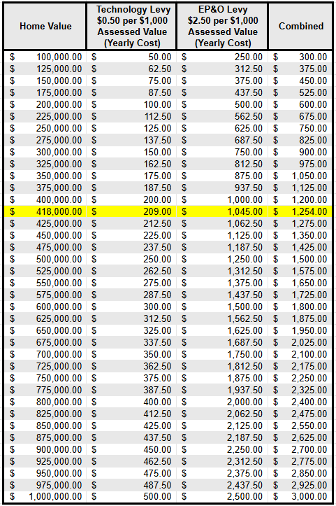 The EP&O Levy will be $2.50 per $1,000 in assessed property value.